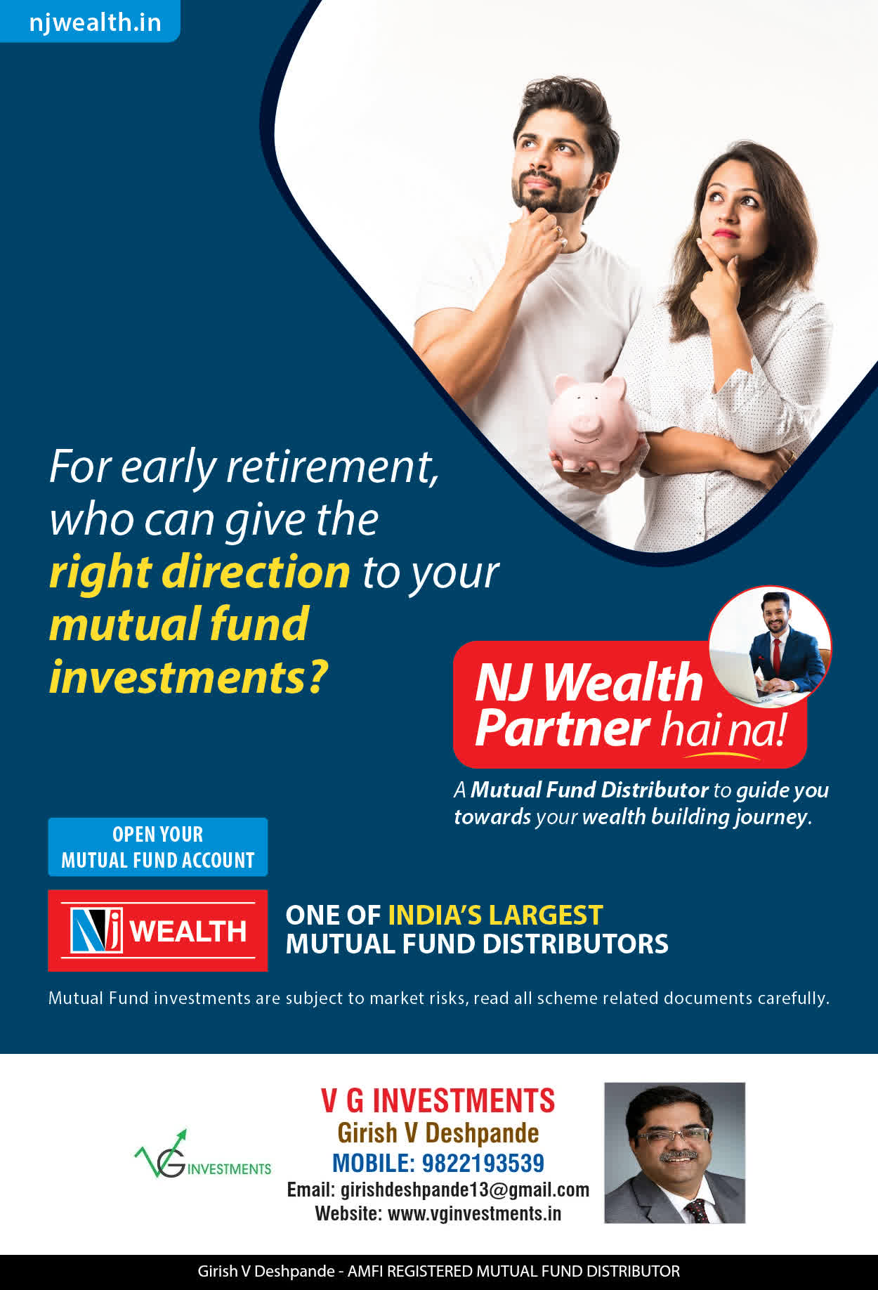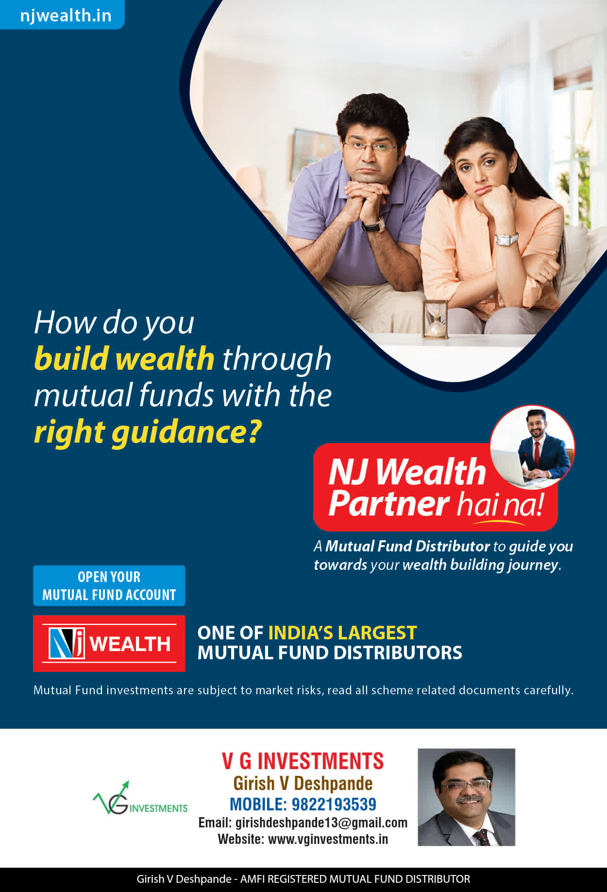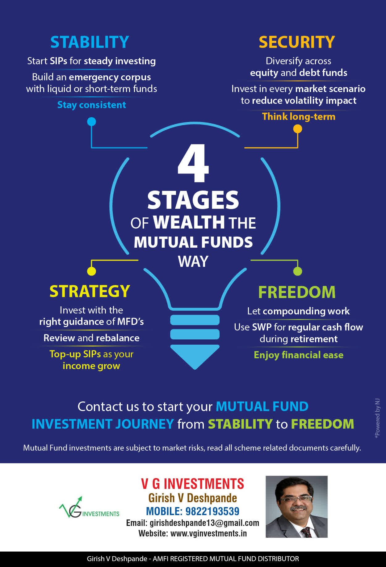 At VG Investments, our mission is to provide our clients with the comprehensive, competent, customised and classy best solutions in wealth creation and wealth management areas. We are driven to provide clients with simple, unbiased and uncluttered professional advice that adds value to their quality of life and results in actionable solutions.