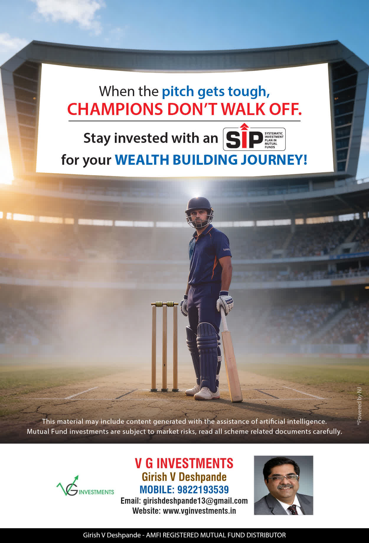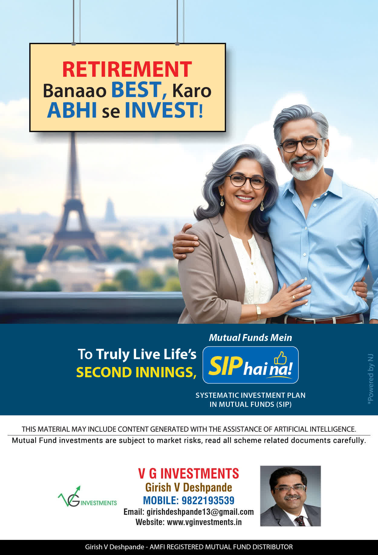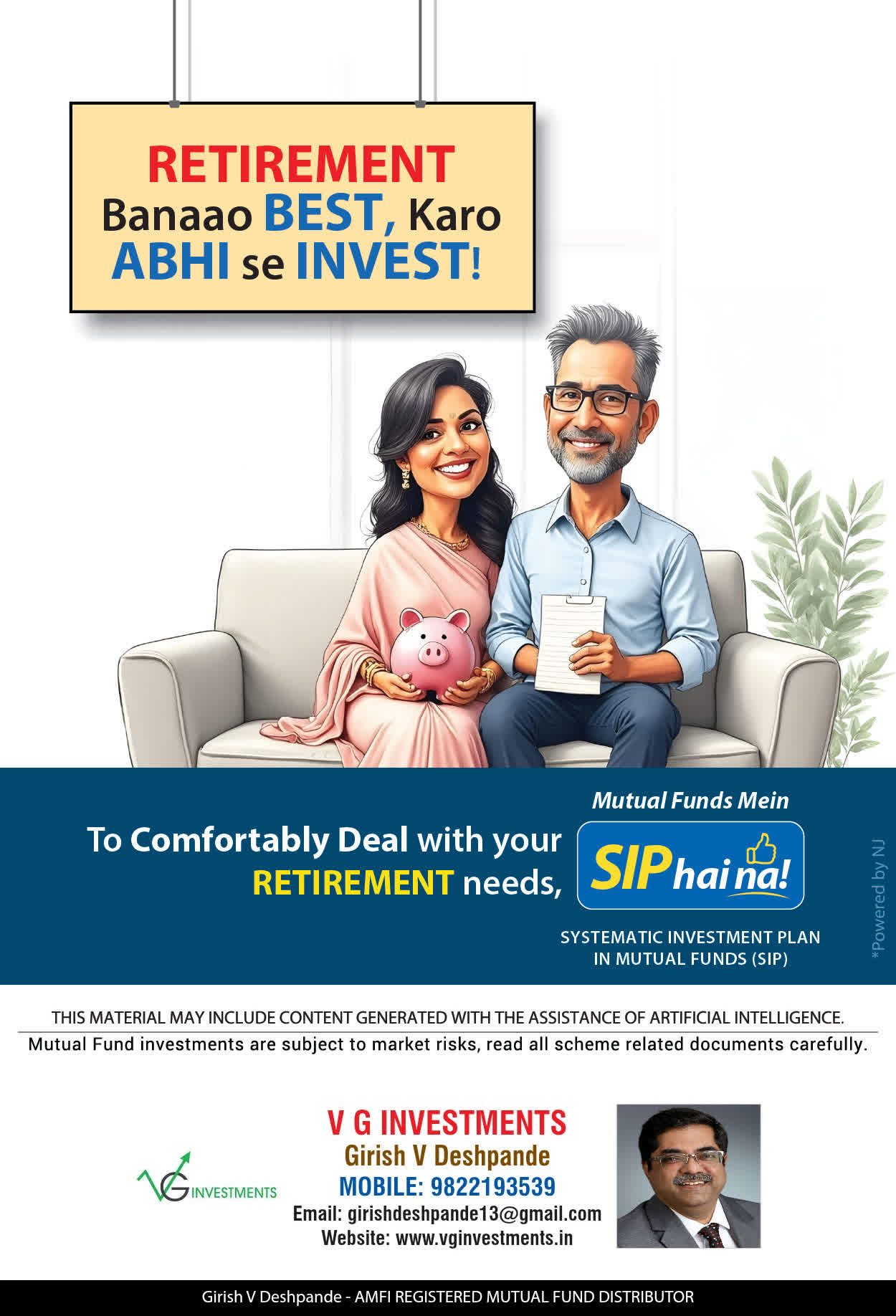 At VG Investments, our mission is to provide our clients with the comprehensive, competent, customised and classy best solutions in wealth creation and wealth management areas. We are driven to provide clients with simple, unbiased and uncluttered professional advice that adds value to their quality of life and results in actionable solutions.